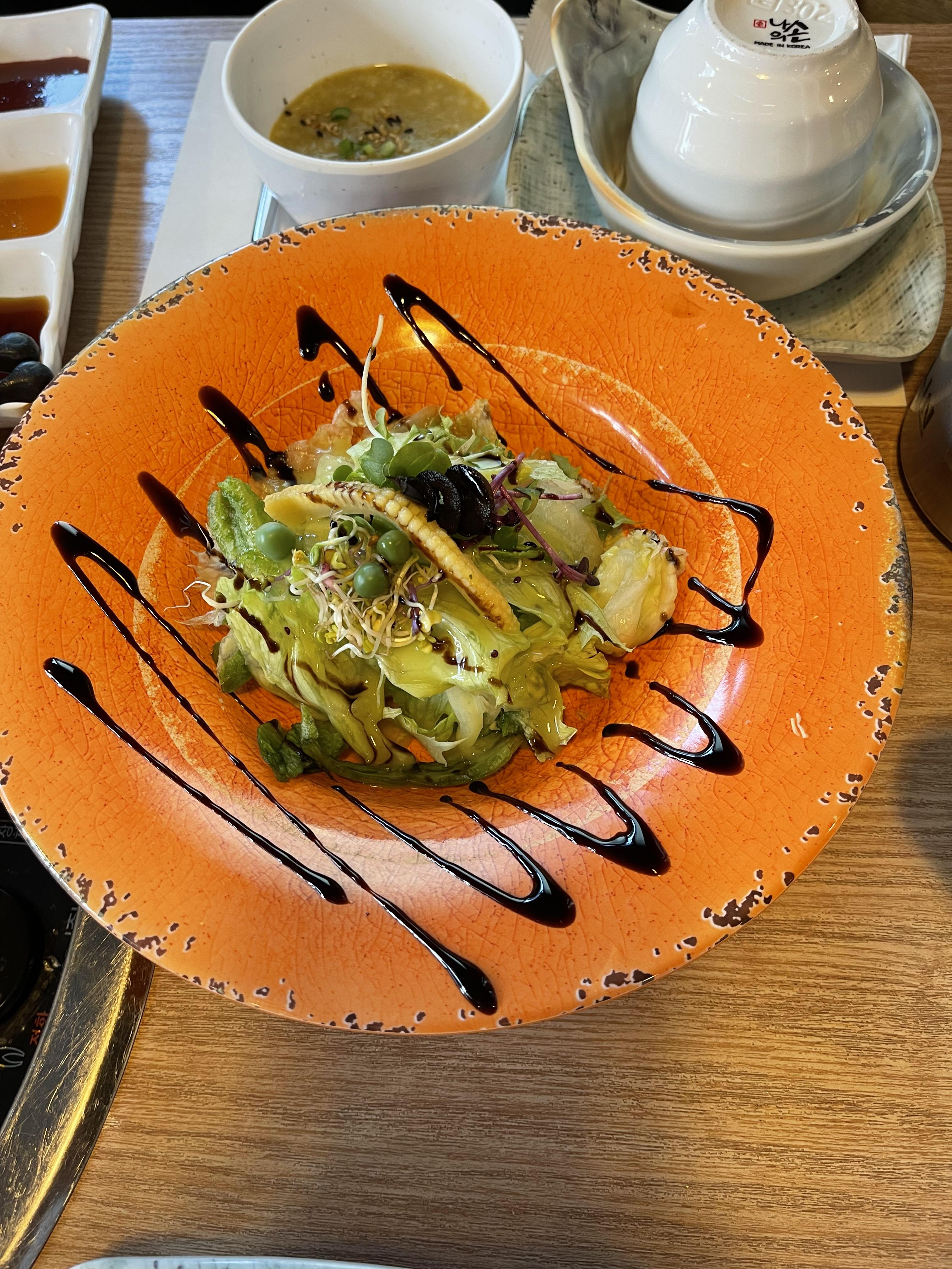모두가 아는 샐러드 맛과 전복죽으로 보이는 죽.