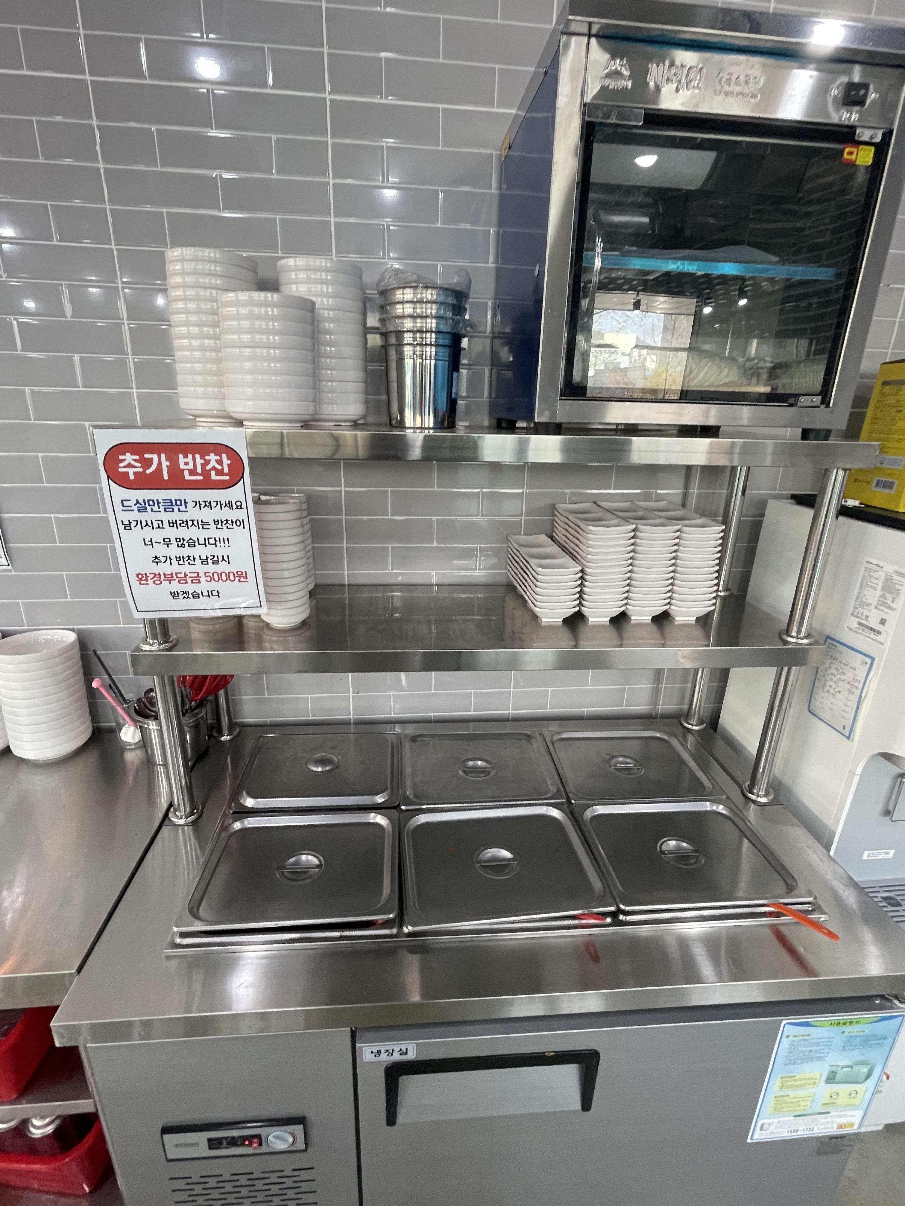 홀이 넓어 중간중간 셀프 반찬코너가 있고 밥이 부족하면 밥솥에서 더 가져다 먹으면 된다.