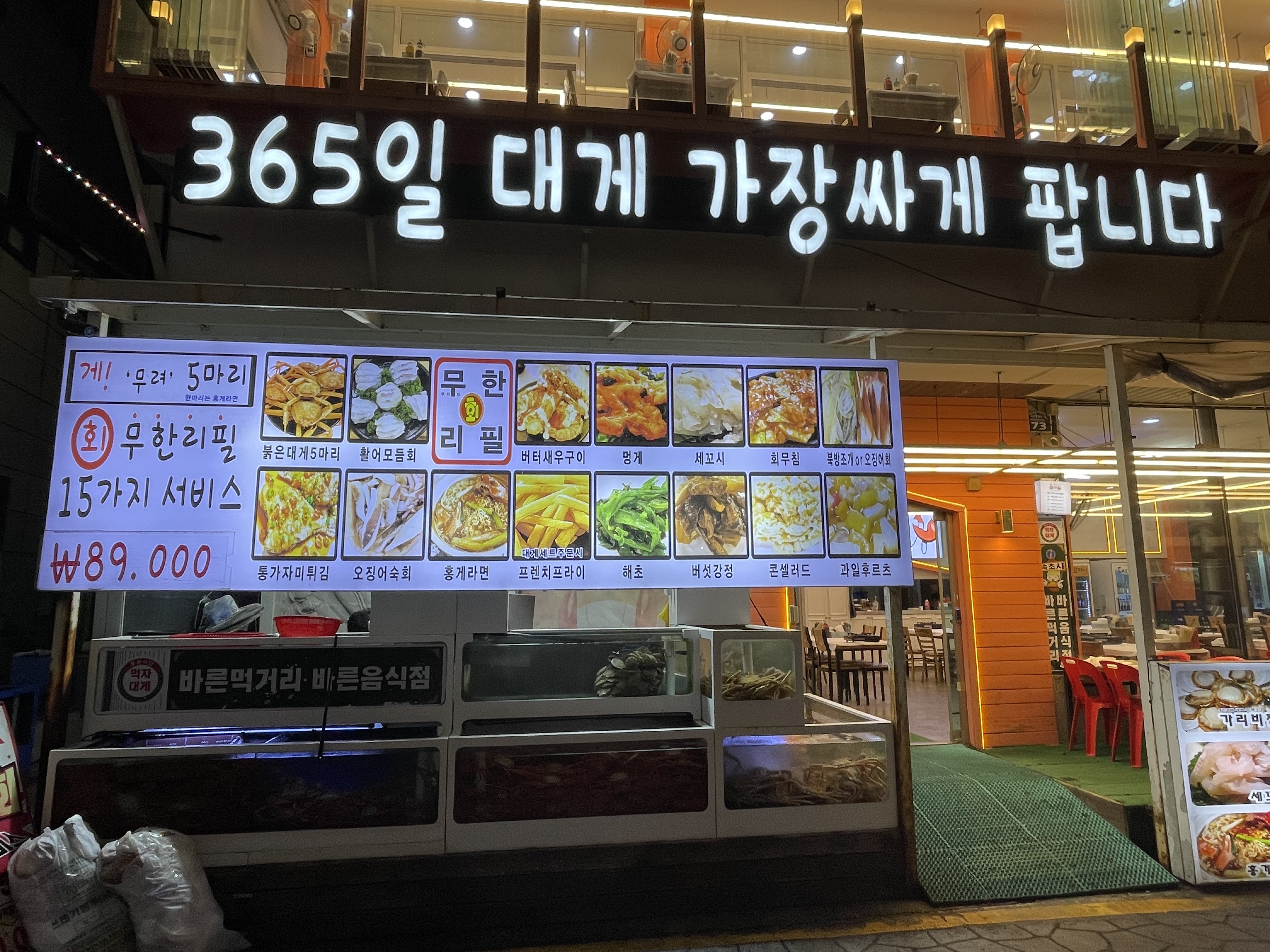 항구를 따라 많은 식당들이 줄지어 있었고 바다를 보며 먹는 사람들이 아주 많았다. 하지만 우리는 좀 더 조용하고 아늑한 환경에서 먹고 싶어 시장 안쪽으로 들어갔다. 그리고 게를 즐기지 않는 나와 아이들이 먹을 수 있는 사이드 메뉴가 많은 식당을 찾아 들어간 곳이 "먹자 대게"이다.