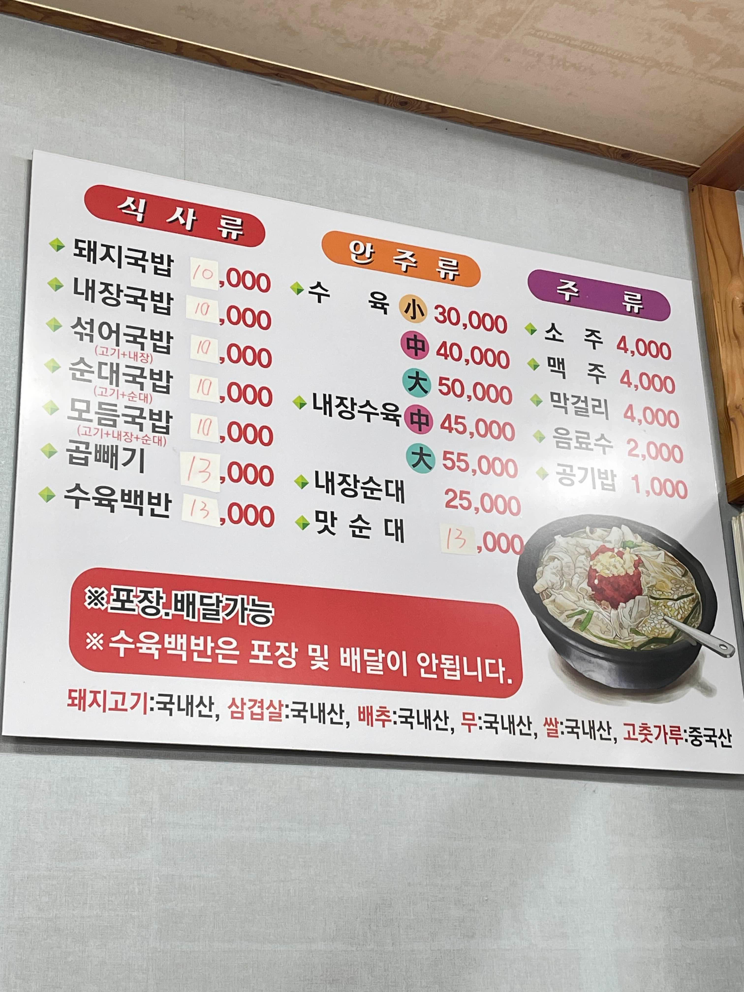 메뉴판을 보니 돼지국밥, 수육백반, 순대국, 특국밥까지 다양했어요.