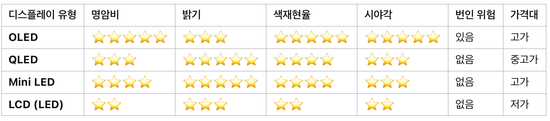 ✖️ 가격대가 높음 – 일반 LCD나 QLED보다 가격이 비싼 편