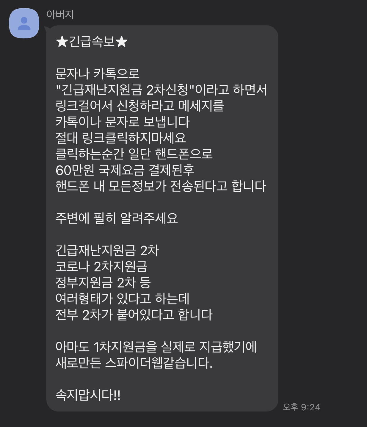 평소 아빠는 걱정이 많으셔서 자식들이 사기를 당하지는 않을까 이런저런 사기/사건 관련 문자를 자주 전달해 주신다. 매사 꼼꼼하고 의심이 많으신 아빠가 어제 한참 엄마 복지관 수강 신청에 몰두하고 있던 순간 다급한 목소리로 전화를 하셨다.